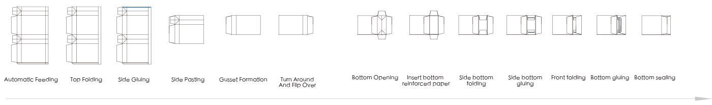 The basic working flow is sheet feeding, positioning, top folding (insert pasting), tube forming, gusset forming, bottom open, servo bottom cardboard inserting(split bottom), bottom gluing, compaction and output.